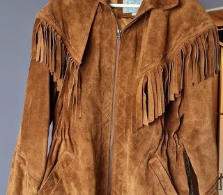 Vends très belle veste en cuir retourné. Daim . Taille 42.44. Neuve. L'avantage vous la portez en country ou vous déclipse la parure à franges . Elle est superbe et neuve .