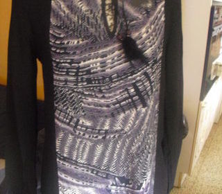 vend TOP NEUF étiquetté A MOTIFS noir violet TAILLE 38 Col tunisien Manches longues Poignets élastiques Goutte d'eau devant - lien de serrage avec perles en bois et plumes no