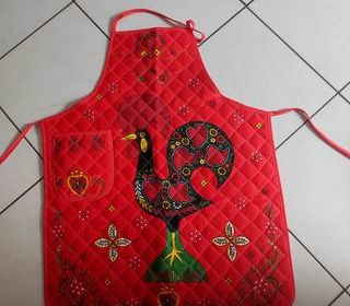 tablier de cuisine à l'effigie du PORTUGAL rouge matelasse avec dessin et marque PORTUGAL NEUF achat pour un cadeau qui a fait doublon Dans son emballage