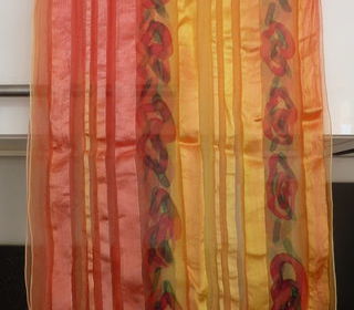 Je vends cette écharpe en satin de soie, de couleur jaune et orangé, avec motifs rouges. Ses dimensions : longueur 105 cm, largeur 35 cm. Elle est en bon état général.
