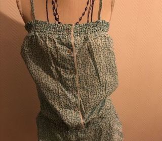 Combishort fond blanc avec rond bicolor Resserré à la taille ainsi que des smocks sur le haut du combishort. Fines bretelles Fermeture par 6 boutons nacrés sur le devant marque M