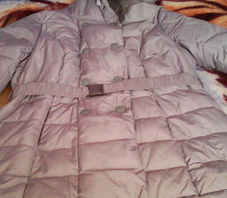 Doudoune femme gris clair avec capuche bordée de fourrure synthétique. Dispose d'une ceinture assortie et de boutons ronds argentés sur une fermeture éclair. Idéale pour les jours