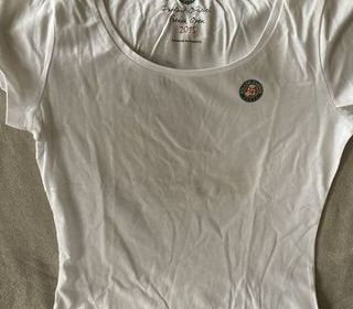 Vends t-shirt officiel Roland-Garros 2015. T-shirt blanc avec illustration d'un joueur de tennis et logo Roland-Garros 2015 sur le devant. Design sobre et élégant, idéal pour l