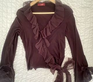 Cache c?ur couleur lie de vin taille S avec volants en vol V, et noeud autour de la taille ainsi qu'aux manches ( très beau rendu) Imitation mousseline