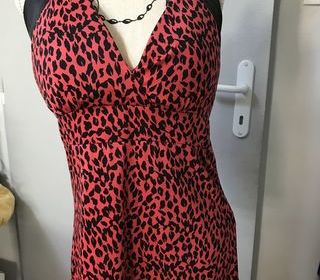 Dos nu long, fond rouge avec dessins d'empreinte de pas d'animaux. Au niveau de la poitrine, coque pour tenir la poitrine, lien noir partant sur le coté pour finir en lien à nouer.