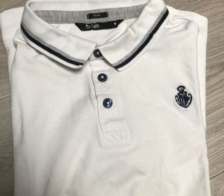 POLO BLANC de marque JULES Fitted, manches courtes taille M, col et manches rayures gris et marine. Fermé par trois boutons marine, écusson marine sur le coté gauche porté mais
