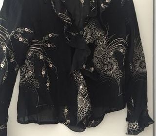 CHEMISIER NOIR AVEC DESSINS STYLE CHINOIS FLEURS STYLISEES OR MARQUE KARINA Taille 40 100% VISCOSE DEVANT COL ET BAS DE MANCHES DOUBLE VOLANTS COORDONNES NEUF ne me convi