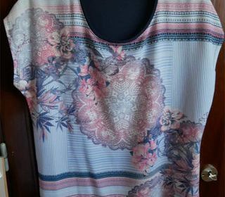 tee shirt bleu rose argenté dos uni bleu marine 5% élasthanne 95 % viscose hauteur 70 cm épaule 50 cm encolure ronde taille 44 va aussi pour du 42 marque Armand Thierry neuf