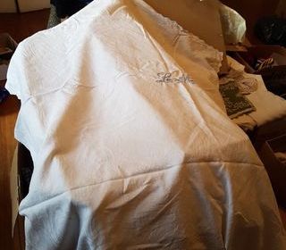 Tissus vintage : - housse de petit édredon blanc avec broderie bleue : Longueur : 81 cm - largeur : 78,5 cm : 4 € - tissus divers, une quinzaine : déguisements... : 5 € - housse
