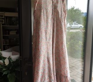 Robe rose à petites fleurs, légère, à volants, bretelles avec boutons, évasée à partir de la poitrine, fermeture éclair au dos et ceinture, 2 poches avec volants, vintage Envoi p