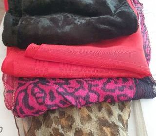 Etoles vintage - Etole bleue, jaune, rose - Longueur 180 cm, largeur 103 cm : 2 € - Etole dans les tons de rose - Longueur 170 cm, largeur 44 cm : 3 € - Etole verte bord beige -