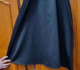 Jupe trapèze longueur au genoux : 50 cm de tour de taille et 72 cm de long, sans élastique (Elastique à remettre). 100 % Polyester. Lavage à 30°.