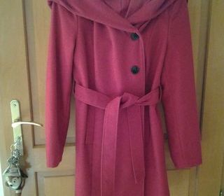 manteau rouge d'hiver femme, de marque (3 Suisses), taille 42, bon état, avec grande capuche, 50% laine + 45% polyester, 2 poches extérieures, serrage au niveau de la taille par
