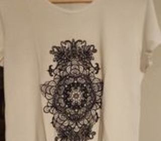 Tee-shirt brodé motif noir, trés léger accro coté encolure réparé qui ne se voit pratiquement plus, état plus que correcte
