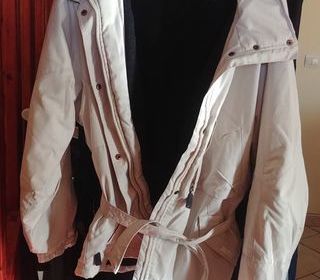 veste d' hiver sans capuche blanc crème, matière protectrice contre le froid, une poche à l'intérieur + 4 poches extérieur dont 2 poches poitrine, ferment tous par fermeture éc