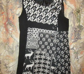 robe de fête en lainage doublée style norvégien avec des décors de rennes de flocons, de fleurs et graphismes, en noire et blanc, entièrement doublée, ouverture par devant avec gro
