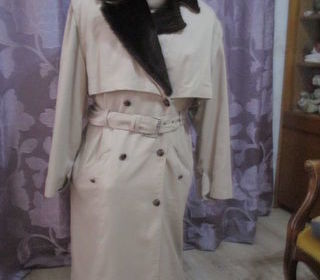 manteau dit "TRENCH COAT" imperméable , style détective avec longue ceinture à oeillets, col fourrure marron synthétique refermable entièrement et boutonnage réversible, deux gran