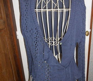 gilet femme en coton travaillé au crochet, couleur bleu marine clair très confortable à fermeture liens en coton et clip metal taille du 38 au 40,longueur 57cm quasi neuf , prot