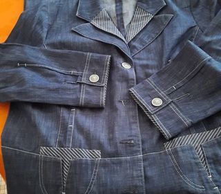 Tailleur en jean de marque CHRISTINE LAURE, taille 48. Il est composé d'une veste, façon blouson, pantalon et jupe. Pas d'envoi, articles remis en main propre. Règlement un
