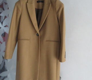 Manteau couleur camel taille L/40 75% laine 25% polyester, doublé viscose, un bouton devant, 4 boutons à chaque manches, a été mis une seule fois, les poches ne sont pas encore déc