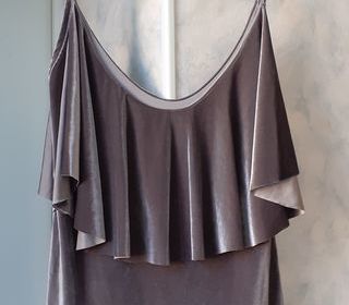 Vends un débardeur original en tissu synthétique velours qui ne se froisse pas, large volant devant et dans le dos, couleur gris uni, taille 40. Longueur sous aisselle : 42 cm.