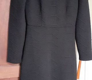 Vends une robe en tissu synthétique floqué doux et épais non doublé, manches longues, cintrée, décolletée dans le dos, fermeture éclair sur un côté, couleur noir uni, marque Gues