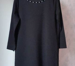 Vends une robe droite, manches longues droites, tissu synthétique lourd, non doublée, beau tomber, couleur noire avec encolure ajourée et des perles de culture blanches nacrées,