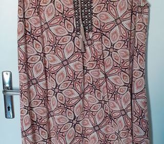 Vends une robe sans manche, forme trapèze, encolure en V, en viscose, très agréable à porter pendant l'été, doublée, vieux rose, blanc et noir, marque Armand Thiery, taille 44.