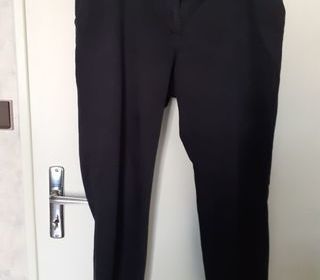Vends un pantalon noir uni, fentes sur le côté au bas des jambes, 98 % coton, 2 % élasthanne, marque H&M, taille 38. Longueur depuis l'entrejambe 64 cm.