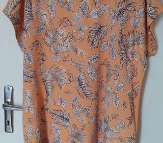 Vends un top manches courtes, 98 % polyester, 2 % élasthanne, couleur jaune avec motifs noirs, blancs et dorés sur le devant, dos jaune uni, marque Armand Thiery, taille 4 (42-44