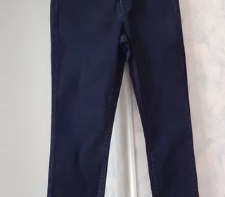 Vends un jean bleu foncé coton et élasthanne, marque Camaïeu, taille 36-38. Longueur entrejambe : 73 cm Largeur de la ceinture à plat : 34 cm.