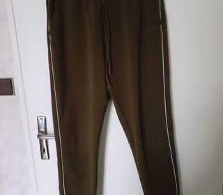 Vends un pantalon genre bas de jogging fluide, kaki avec une bande blanche sur les côtés, matière synthétique, 2 poches latérales, marque Jennyfer, taille L (40). Longueur depui