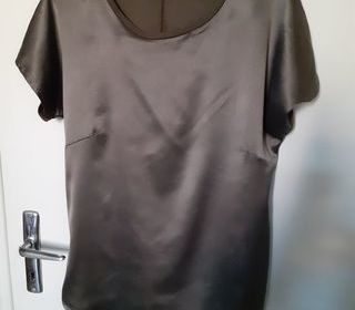 Vends un top manches courtes, tissu satiné devant et mat derrière, couleur kaki, arrondi à la base, plus long derrière que devant, 100 % polyester, acheté chez Zeeman, taille 36.