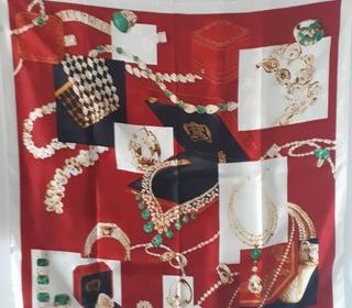A s'offrir ou à offrir Beau carré Cartier Authentique en soie Neuf dans sa boîte Fond rouge avec motifs bijoux, écrins à bijoux et panthère. Lumineux et seyant - 87x87 150