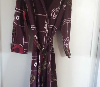 Fait main Très belle robe chemise tout en soie boutonnée jusqu'au milieu devant avec ceinture assortie. Manches longues. Bel imprimé sur fond prune et joli rendu Hauteur 1,15 m