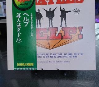 Disque vinyle "The Beatles - Help!", édition japonaise avec bande obi verte présente, pochette en bon état général avec écritures en anglais et japonais.