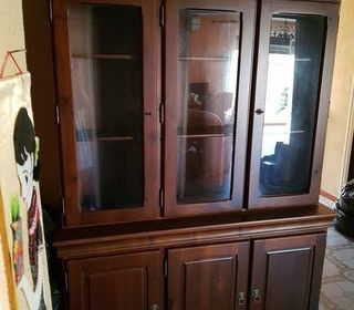 Bibliothèque en bois brun, Vitrine 3 portes avec étagères. Meuble bas avec 3 portes et étagères. Très bon état.