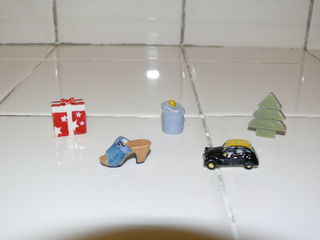 FEVES : 0€50 l'unité Figurines miniatures représentant divers objets du quotidien : cadeau, bougie, sapin, chaussure, voiture