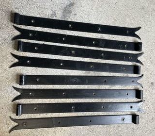 Vends 12 pentures de volets en acier, peinture noire. Longueur 55 cm sur 4 cm de haut et 4 mm d'épaisseur. Percées de 4 trous (8 mm) de diamètre. Vendues avec les vis de fixation