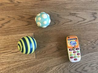 2 balles pour enfant de 1-3 ans avec différents types de toucher et de rebond pour développer la prise en main et le placement dans l'espace. Téléphone Vtech en francais et anglai