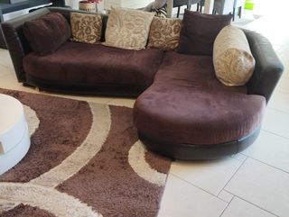Canapé d'angle cuir et tissu de très bonne facture acheté chez Bois et Chiffons. Elégant spatieux et confortable en très bon état. Marron chocolat