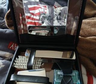 Trousse de toilette homme en cuir noir neuve comprenant 1 brosse 1 miroir 1 flacon avant rasage électrique mennen 1 boîte pour savonnette 1 boîte pour brosse à dents