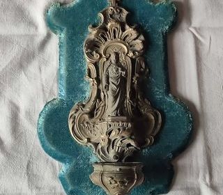 Vends ancien bénitier en feutrine bleue, bénitier et la statue en argent, hauteur 28 cm, largeur 16 cm 22 euros Possibilité d'envoi contre frais de port