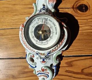 Baromètre en faience de Rouen peinte à la main. Parfait état, aucun éclat. Je l'ai longtemps utilisé, il fonctionne parfaitement et avec précision. Il pèse 700 grammes environ,