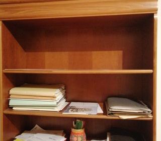 Bibliothèque en bois exotique, parfait état, couleur brun doré. H 200cm x L 0.94cm x P 0.33cm.