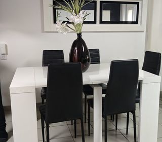 A VENDRE TABLE CONSOLE BLANC BRILLANT FERMEE DE 42 CM X 95 CM LIVREE AVEC 3 ALLONGES DE 52 CM X 95 CM BON ETAT