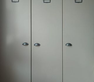 Armoire 3 portes en bois laqué blanc cassé, déco façon vestiaire, très bon état. Dimensions en cm : 123x52 hauteur 190 (dont pieds 10 cm)