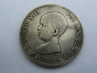 Pièce 5 Pesetas 1891 en Argent Rey Const De Espana PG-M Alfonco XIII Por La G.De Dios Règlement en chèque avec délais encaissement ou plus rapide virement Frais de port lettre