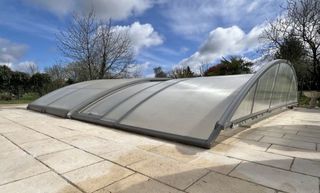 Abris de piscine Abrisud composé de 4 modules de 1,75m chacun coulissants qui peuvent recouvrir au total 7,10m x 6,90m En bon état Me faire une offre de prix.