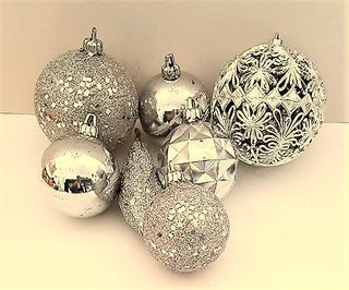 Lot de 7 boules de Noël argentées, aux motifs décoratifs élégants. plastique, Incassables 6 rondes et une longue